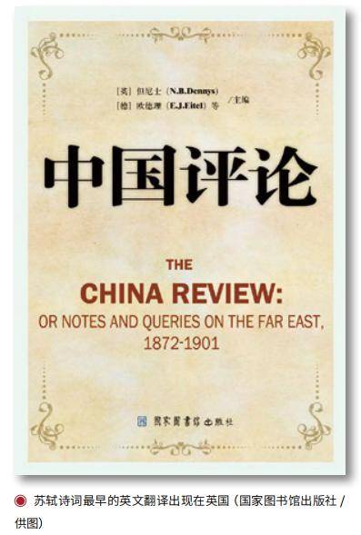 苏轼诗词最早的英文翻译出现在英国。在1872年7月出版的英文汉学杂志《中国评论》创刊号上,英国人包腊发表《苏东坡》一文,译介了苏轼被贬惠州时所作的《纵笔》《广州蒲涧寺》及3篇谢表。