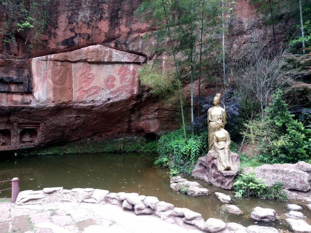 青神县中岩寺苏东坡与王佛初恋时取名的“唤雨池”及苏轼王弗像(郑光福 供图,图源:四川方志图库)