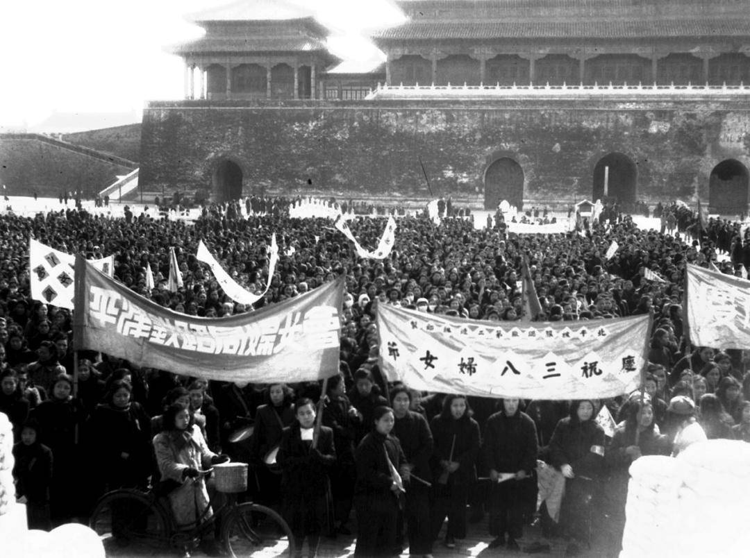 解放战争期间,随着“打倒蒋介石,解放全中国”这一口号的打响,各城市的妇女运动和“三八节”活动迅速展开。北平和平解放后的第一个“三八节”的历史影像,成为北平史志中重要的一页。随之,中国妇女第一次全国代表大会在北平中南海怀仁堂召开。这是中国妇女有史以来第一次全国规模的盛大会议,为在中国共产党的领导下凝聚各界妇女群众的共识奠定了基础。中共中央向大会发来贺电,毛泽东等中央领导同志接见了全体代表。毛泽东为大会题词:“为增加生产,为争取民主权利而奋斗。”[《毛泽东年谱》(1893—1949)下卷,中央文献出版社2002年8月第一版,第469页]