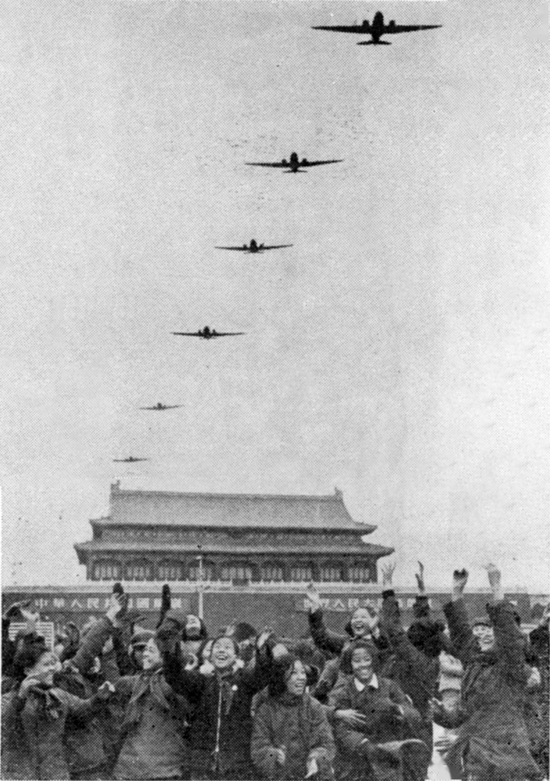 1952年“三八”妇女节,新中国第一批女航空员光荣地接受了首都人民的检阅。当这支铁鹰飞过天安门上空时,在天安门前等待已久的女学生和家庭妇女们热烈地向她们欢呼!
