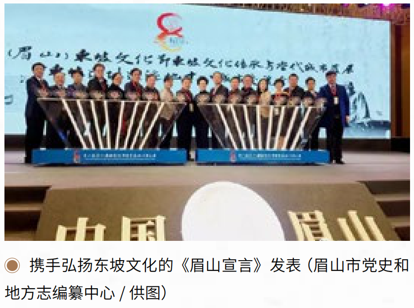 2017年11月,第八届(眉山)东坡文化节暨首届四川音乐周期间,首次迎来全国18个东坡遗址遗迹地城市的“全家福”,并共同签署《东坡文化传承与当代城市发展眉山宣言》,建立东坡遗址遗迹保护和利用合作机制,协同开展东坡遗址遗迹申报世界文化遗产工作,加强东坡文化遗产的传承和发扬,在城市建设中突出东坡文化的创造性转化,延续东坡文脉,彰显东坡文韵,推进东坡文化名城建设和发展。