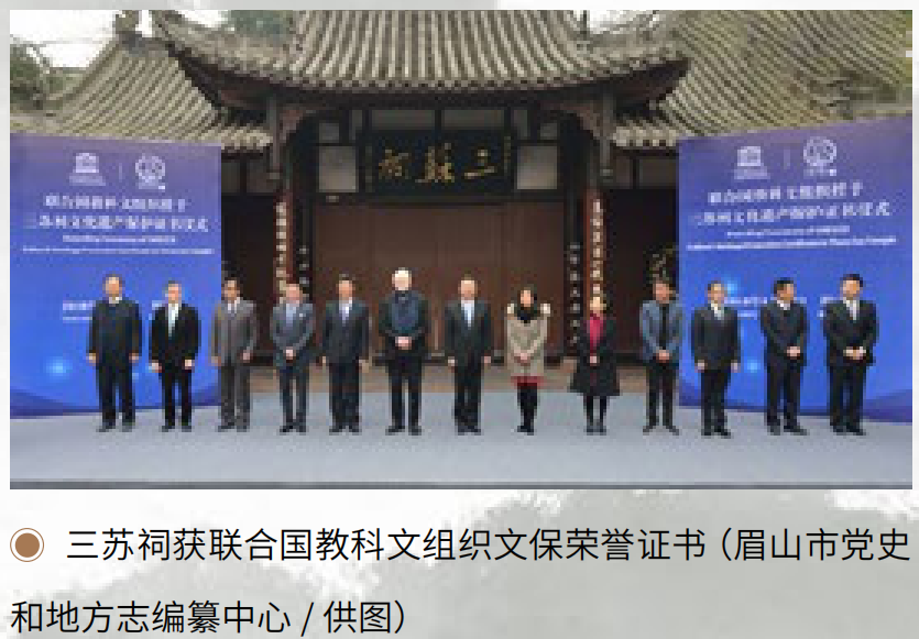 受2013年“4·20”芦山强烈地震严重影响的三苏祠,被列入国家文物局灾后恢复重建首批重点项目,实施文物古建筑本体修复等7个项目和眉山市三苏遗址保护提升工程,文物保护和展陈功能得到极大提升,并被评为全国文保维修优秀工程、四川省金熊猫奖先进集体。2018年1月被联合国教科文组织授予文化遗产保护荣誉证书,肯定三苏祠在世界范围内弘扬中国文化所作出的贡献。