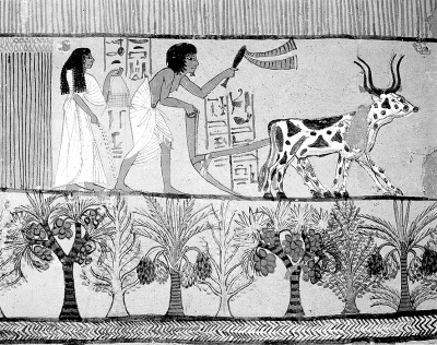 亚麻可以说是人类最早使用的植物纤维,也是最早用于制作服装的材料之一。在人类发展史上,大量种植亚麻并使其在社会中占有重要地位的是古埃及文明。在一万年以前,古埃及人就在尼罗河的河谷地带种植和驯化亚麻。吸水性强、散热快、张力强且柔软的特性,使得亚麻在炎热的古埃及成为最佳的服装面料。在公元前约5400年,随着织布机的出现,这里的织制技术已经达到了较高的水平。古埃及文明遗留下的丰富的人物壁画和雕塑向我们展示出古埃及人劳作时的服装样貌,从中还可以感受到法老华丽的着装风格。