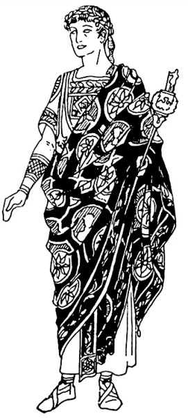 古希腊服装的形制强调美化人的本体,特别注重突显人体的曲线。在面料的选择上,古希腊人通常使用以白色为主的毛织物和薄麻织物。服装的结构相对简单,通常由一块未经剪裁和缝合的矩形布料制成。这块布料通过披挂、缠绕,再用搭扣、别针以及腰带的固定,形成覆盖人体的服装。