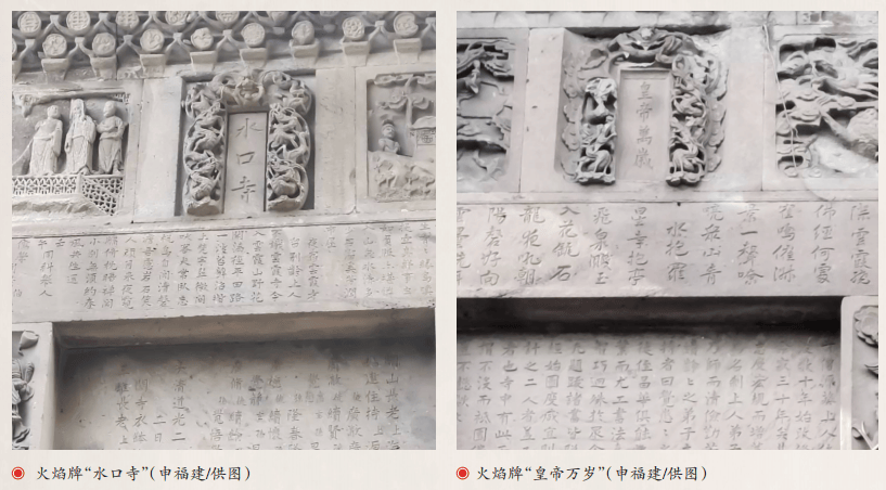 牌坊正面有五龙抱火焰牌“皇帝万岁”,背面火焰牌为寺名“水口寺”。通过查阅资料,至今没有发现其他牌坊在火焰牌上刻“皇帝万岁”的,为什么要这样设计呢?从秦始皇嬴政自称“始皇帝”开始,封建社会的最高统治者都称皇帝。因此,火焰牌上刻“皇帝万岁”,无论朝代如何更替,都不犯上,可以一劳永逸。念着“皇帝万岁”,面对油盐柴米,这是人间凡尘。放下恩怨情仇,参禅礼佛,水口寺是心灵的栖息地。尘世与佛缘间隔一牌坊,入世与出世就在一念间。