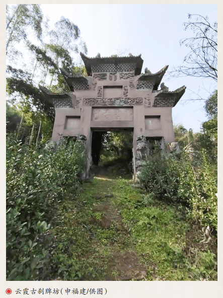 四川省内江市市中区(原内江县)凌家镇水口村留存一座山门牌坊——云霞古刹牌坊,造型端庄,斗拱繁复,雕刻精美。云霞寺本名水口寺,所在村至今仍叫水口村,因地处云霞山得名云霞寺。它始建于明,清嘉庆年间修葺,因地处龙门古镇要道,连接着自贡、泸州、内江等地,所以四面八方的商人、信众前来朝拜,曾香火鼎盛,名噪一时。云霞寺早已倾圮,山门牌坊历经岁月的风霜雪雨,却依然挺立,令人称奇。