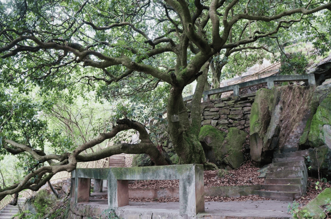 古树也曾历经过风霜雪雨,迭遭过天灾人祸,如今仍枝干虬劲,亭亭如盖。其中一株干周5.6米,高16米,犹如一把巨大的绿伞,两个人合抱不过来。周边覆于翠绿,所形成的浓荫约有三四十米的直径。