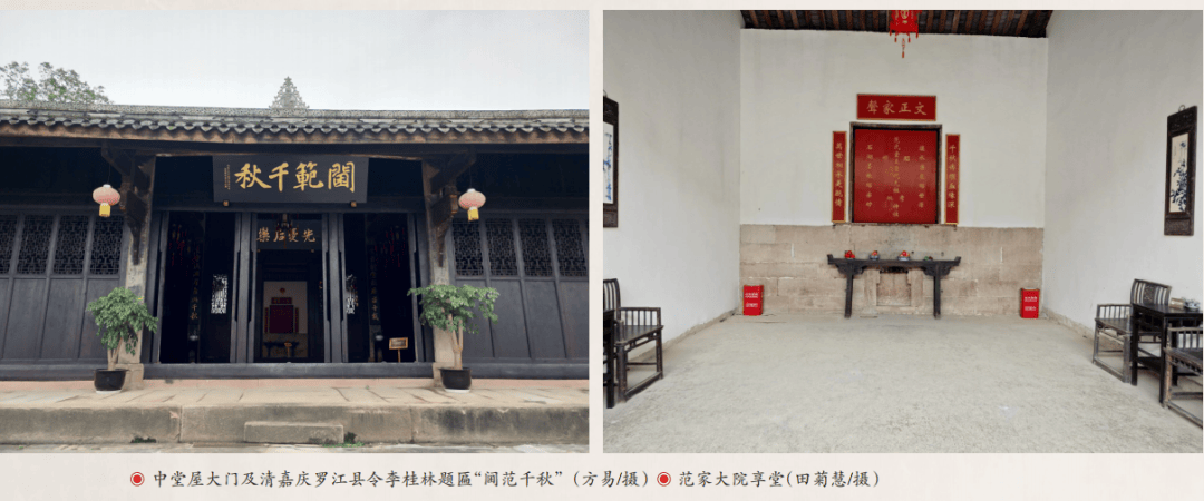 大院楹联、龛联、字画等尽显清廉家风与高雅情趣。中龙门门联:“瑞霭龙门祥联风阁,香生桂苑秀挺兰阶。”上联“龙门”引《后汉书·水族·龙门》“鲤鱼跃龙门”典故;下联“桂苑”用《世说新语·言语》典故,喻范氏子孙承先祖遗风争取科第。左龙门楹联“雅爱山居多乐趣,闻听响石有清音”,分别将大院背靠的“老虎山”和大院东北角的著名“响石”胜景嵌于联中,以表达造屋者对大自然美景的热爱与尊崇。右龙门楹联“自喜奂轮光世泽,还崇廉俭绍家风”,直抒造屋者胸意,既阐释自身传承又期盼后世子孙们能继承祖辈们清廉勤俭的家风。二进屋中间为中堂屋,阔200余平方米。屋梁悬清嘉庆罗江知县李桂林题书匾额“阃范千秋”,褒扬范氏家风。堂屋正中挂先祖范仲淹画像,画像配“利贞能载物,柔顺以承天”联,“利贞”语出《易经》“元亨利贞”句,意为“有益、美义、正道、坚定”;“柔顺”语出《易·坤》“柔顺含弘”句,意为具有温柔、顺从品质,能包容与博纳,显示屋主称颂先祖范仲淹对大道的坚定和厚德载物、心系众生的情操。额文“先忧后乐”,集自范仲淹《岳阳楼记》中“先天下之忧而忧,后天下之乐而乐”句。屋内梁柱刻“念开创劳形历茲十载,冀守成润屋自此千秋”联,两侧联文分别记先祖博大胸怀、高尚情操及创建大院历10年艰辛,彰屋主立志继承光大先祖家国情怀和守成创业之家风。大院西端高处房屋为享堂,是供奉先祖牌位的地方。屋面高耸,柱梁更粗壮,门墙更宽阔,装饰更精美。享堂两墙正中设凹形神龛,供奉范氏历代先祖,内龛联为“千秋传继血缘深,万世相承是亲情”,外龛联是“让水廉泉绵世泽,石湖墨帐绍宗功”,横额“文正家声”,壁上悬挂范仲淹画像及其名篇《岳阳楼记》。这些设施及联文,明显与众不同。联文未见“求富贵荣华”“盼发财升官”字样,讲的是“血缘”“亲情”,求的是“廉让”(喻清廉)和“宗功”“家声”,喜的是山水怡情。