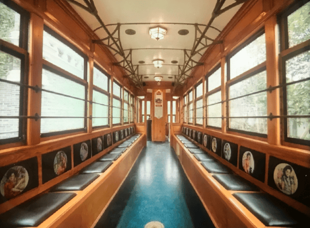 木质车门,海青色地板,皮质座椅,靠背处的倾城民国女子画像,无不向游客们讲述着清末民初那个年代的风情。