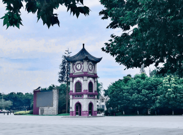 安仁古镇公馆老街前的广场上,矗立着一座3层宝顶4角塔式钟楼,它掩映在郁郁葱葱的树木之间,仿佛在向游人们娓娓诉说着这座古镇的自然、历史、地理环境等情况。