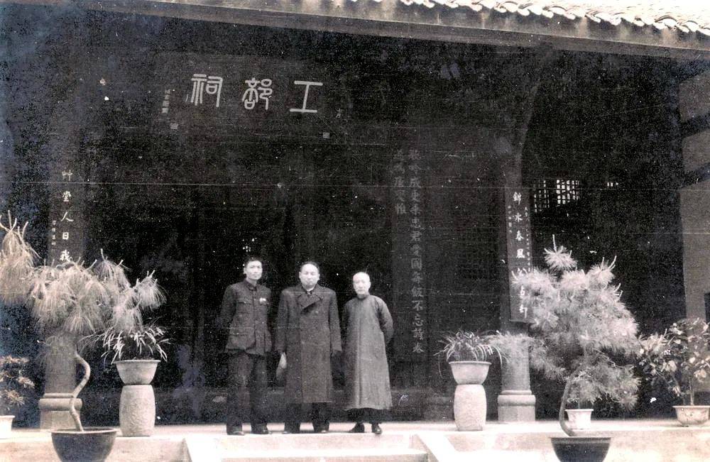 1960年前后,李劼人(右一)与范长江(右二)、林延年(左一)在杜甫草堂工部祠留影(李劼人故居博物馆 供图)