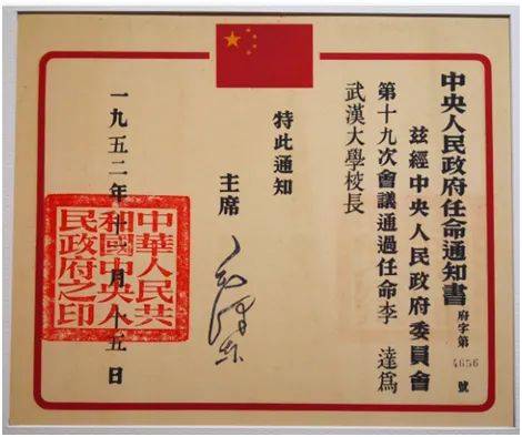 1952年11月15日,中央人民政府任命李达为武汉大学校长的通知书