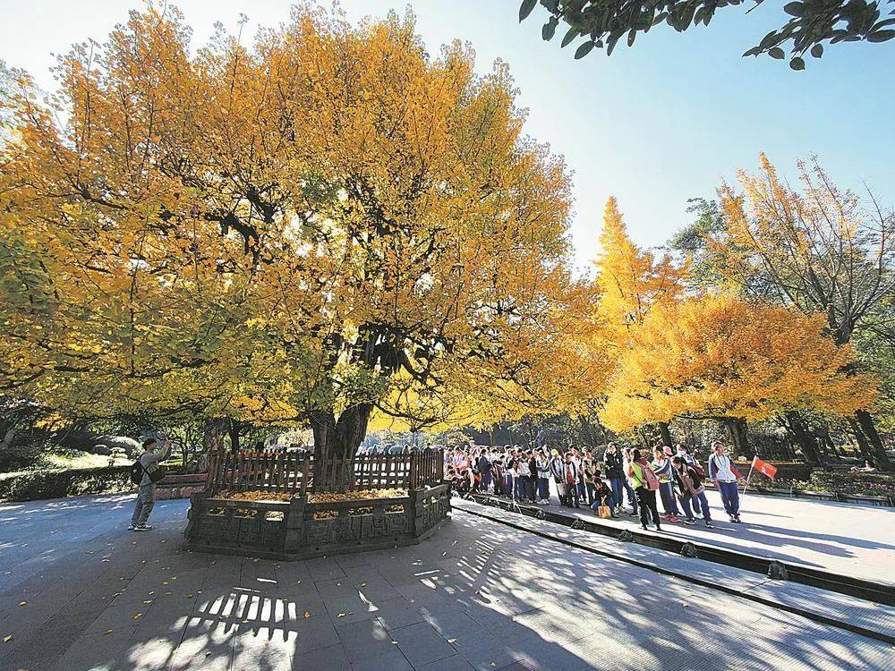 此次造访时是小雪时令,正是银杏风舞的黄金季节,笔者在都江堰市离堆公园看到了满身披着黄金甲的“张松银杏”,金色叶片富丽浓密,透露出一种无以名状的神秘。