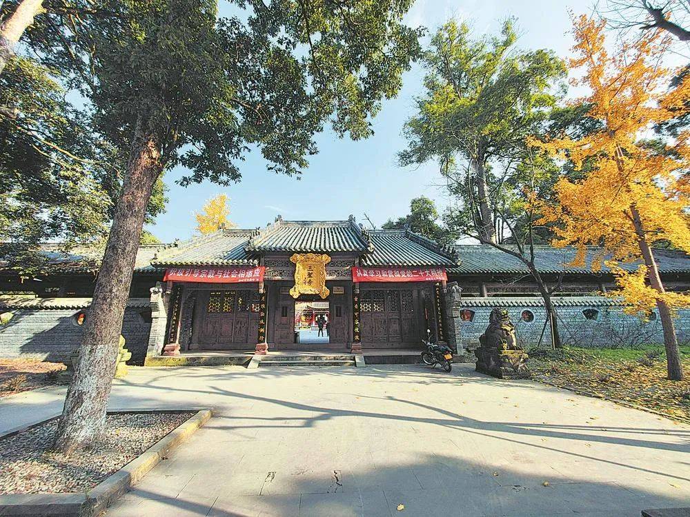 寺庙僧人给我指正了“张松银杏”曾经的位置,在三圣寺正门侧,钟楼旁。而今的三圣寺仍是一派道仙之气,寺内楠木成林,遮天蔽日;白鹭翔集,鹤影飘逸;晨钟暮鼓,古风浩荡。在三圣寺原寺门有一副楹联:“长叹一声天地窄;放开两眼古今无”。读张松,看银杏,悟联语,颇有意蕴。