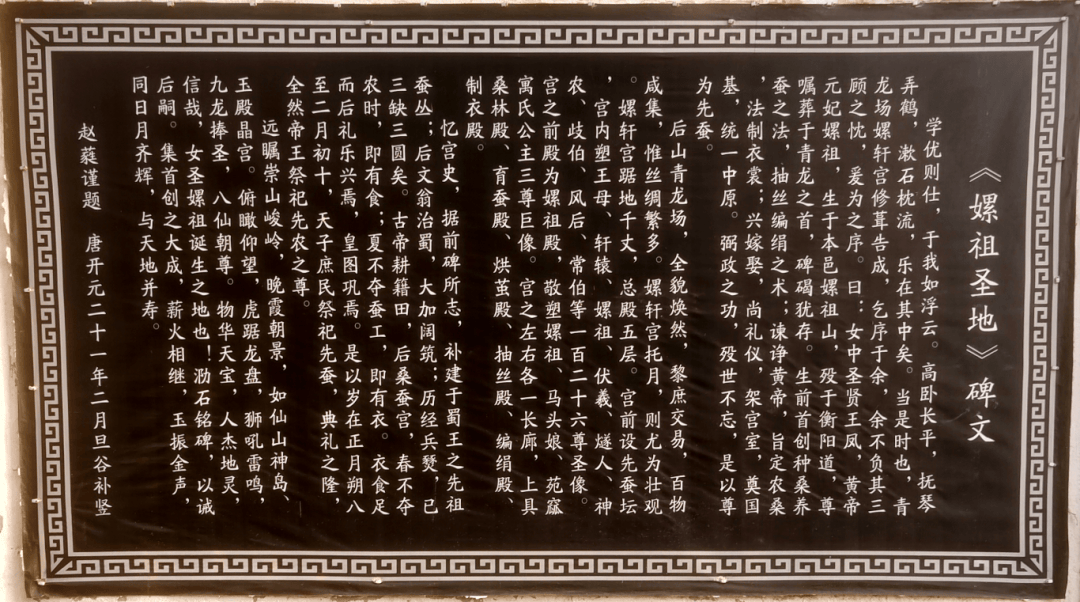 1991年,该县一乡镇退休老干部王映维,向县旅游机构反映,说他手里有一嫘祖圣地碑的文字抄录,碑文大约有500字,由唐代李白之师赵蕤所撰。王映维老人曾于1945年和1949年两次将碑文抄录在小学课本上,而该碑在1947年被雷暴雨导致的山洪所毁。碑文内容包括说明撰文缘由、嫘祖的身份以及出生地和归葬地,嫘祖被称为蚕神的丰功伟绩、嫘轩宫的变迁和现行构造、嫘轩宫的形胜风景和祭祀活动,以及立碑的时间。