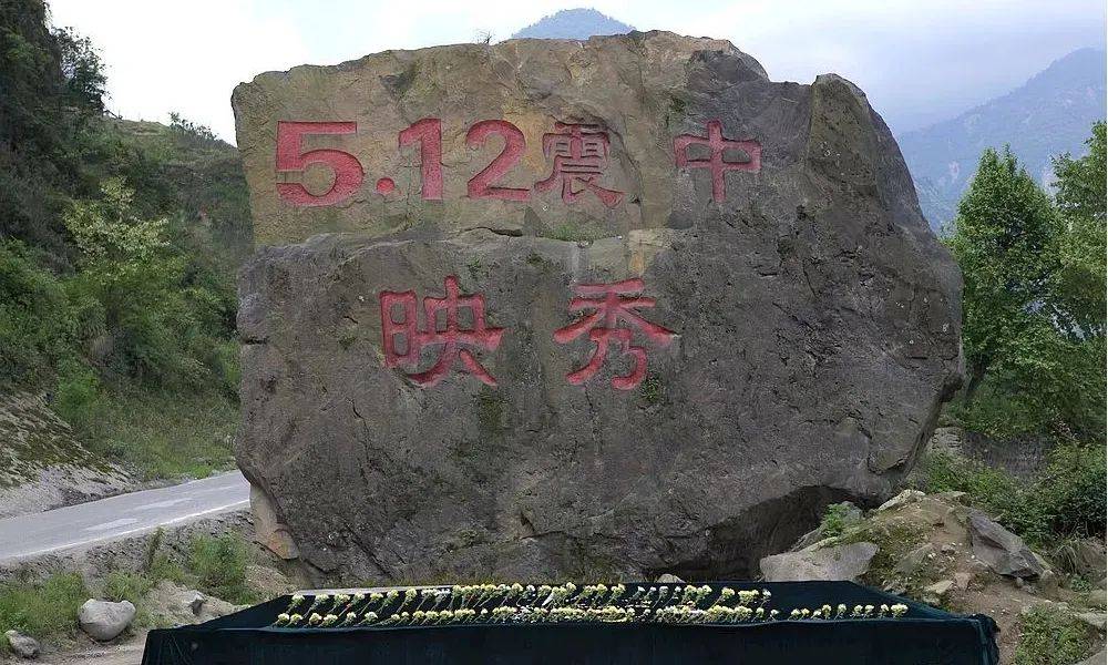 后来,再到映秀镇,发现当年我们看到的那尊巨石,已经被刻上了“5·12震中映秀”字样,成为永久的标志性景观,供游人照相留念。地上,开满不知名的花儿。