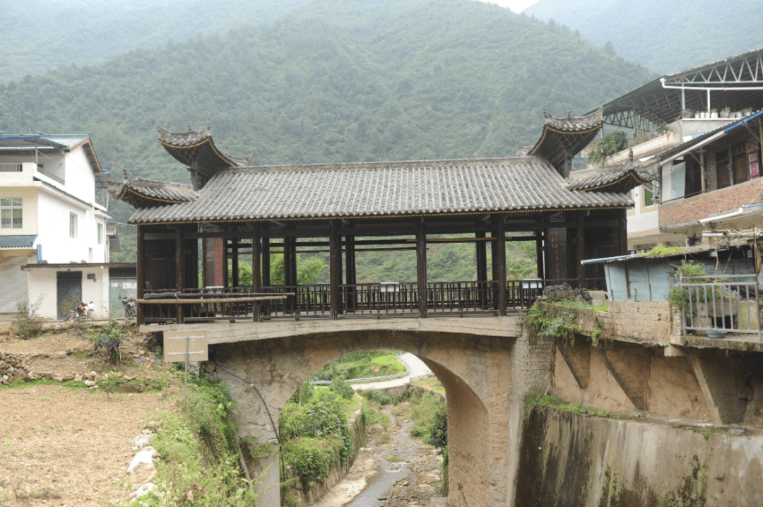 据文物登记表记载,河南廊桥(烟雨廊桥)建于清代。该桥在2008年因地震和山洪被一度损毁,后于2009年按原貌重修。河南廊桥为杆栏式木质廊桥,桥面用八排木板竖砌,整桥长14米,宽3米,跨度18米,桥上建有回廊,为六柱五间。单檐硬山顶穿斗式,通高5.6米,对研究地方人文、技艺有一定价值。
