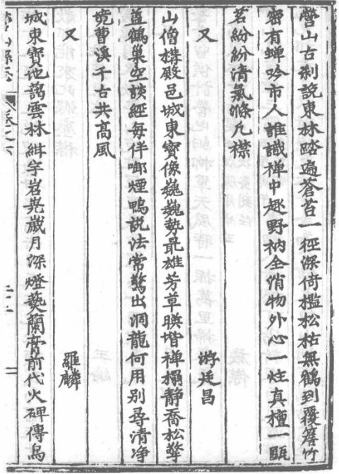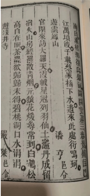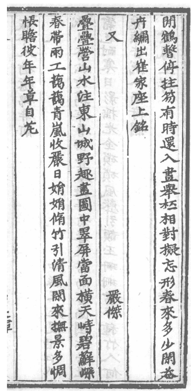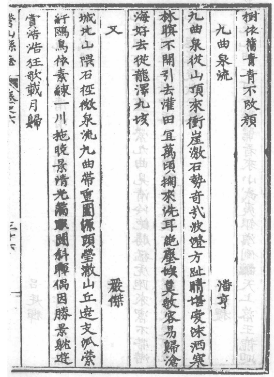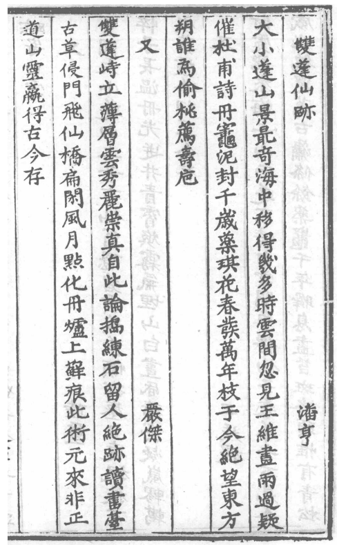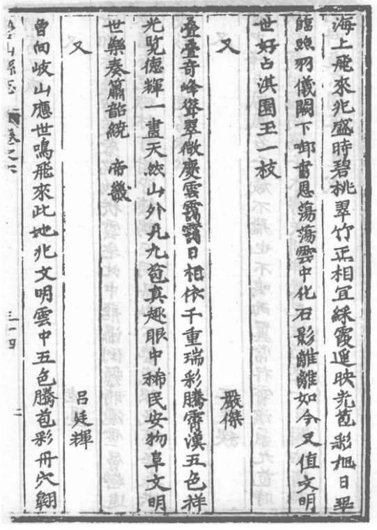 最后是诗句里的一些文字变化。万历版中的“霞帔翩翩列羽仙”原诗的“翩翩”,在乾隆版为“片片”,在同治版为“星冠”;万历版中的“土釜丹成馀宿火,山房经罷散轻烟”原诗的“馀”,在乾隆版为“籠”。在同治版中“釜”为“竈”,“馀”为“留”,“轻”为“青”;万历版中的“玄猿花煖寻常到,白髪松高自在眠”在同治版中“玄”为“元”,“髪”为“鹤”;万历版中最末一句“又开筵”,在乾隆版为“又开筵”,在同治版则为“水涓涓”。