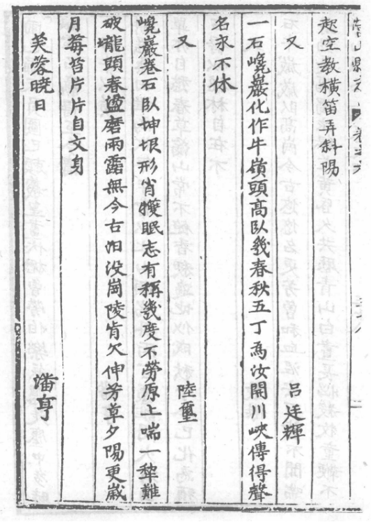 天一阁明万历王廷稷版《营山县志》载潘亨诗12首,现依次附诗与县志截图于后: