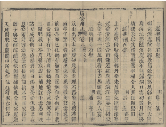 在《广安州志》中也记载有潘亨和张海各写的《题兴国寺石壁》,与《顺庆府志》所载内容一样。但在职官记载中“张海嘉靖中知州,潘亨万历中任州同知”。张海和潘亨的名字和官职都没有什么问题,但记载的任职时间却与康熙《顺庆府志》有很大的出入。
