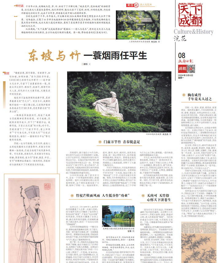 一株株苍翠挺拔的竹,架起了成都与苏轼精神世界的桥梁。对于成都,苏轼将其视作故乡,写下了“乘槎归去, 成都何在, 万里江沱汉漾”的乡愁;对于竹,苏轼则留下了“门前万竿竹,堂上四库书”“宁可食无肉,不可居无竹”“竹杖芒鞋轻胜马,谁怕?一蓑烟雨任平生”等无数传世经典。