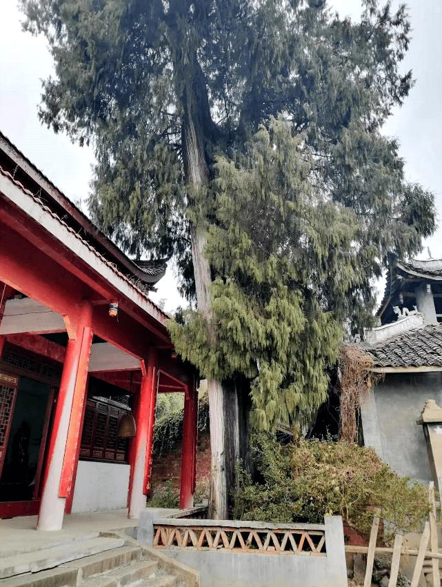 位于观音殿侧与大雄宝殿转角处的“荆山双柏”,颇吸引游人的眼球。仰视此树,仿佛见到翠云廊晋柏。它高达22米,枝梢蓊郁,树影婆娑,胸径近两米,三五人伸臂方能合围。说是双柏,其实是一株树在两米左右,一分为二生长而成,犹如连体孪生。据传是乾隆四十八年(1783年),寺庙住持如参所植。此树在绵阳当然是挂了号的,被编为市重点保护树木029号。一树有两通碑刻载记,实属少见。有民国十八年(1939年)的《荆山滴米寺双柏记》,更有清代绵州名儒汪广猷《荆山滴米寺双柏记》。“只能保护,不可损毁”字迹尚能辨识。可见中华民族历来都有植树护林重视生态的传承。