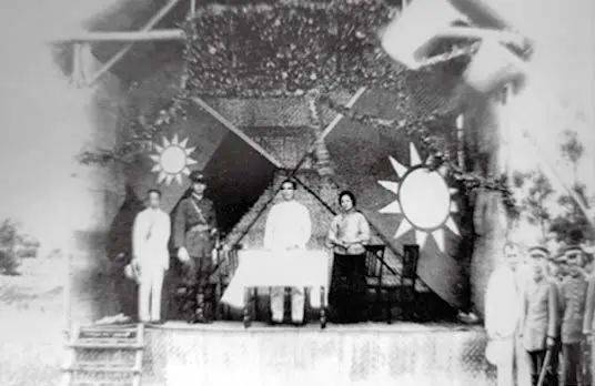 黄埔军校开学典礼。左起:廖仲恺、蒋介石、孙中山、宋庆龄