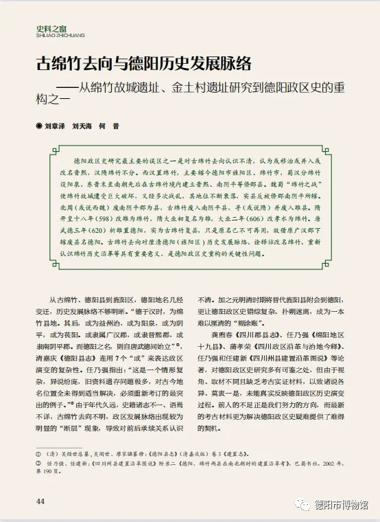 2023年,《古绵竹去向与德阳历史发展脉络——从绵竹故城遗址、金土村遗址研究到德阳政区史的重构之一》《阳泉地望及其对德阳绵竹两县历史沿革的误导——从绵竹故城遗址、金土村遗址研究到德阳政区史的重构之二》在《巴蜀史志》2023年第2、3期连载。《“德阳”“旌阳”地名考源——从绵竹故城遗址、金土村遗址研究到德阳政区史的重构之三》在《巴蜀史志》2023年第5期发表。