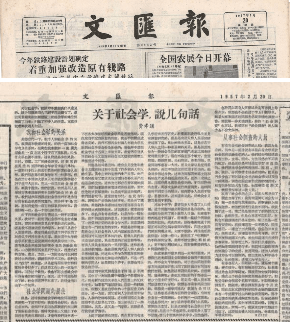 1957年2月20日,《文汇报》发表费孝通文章《关于社会学,说几句话》。他在文中写道:“我们是用人类学的方法来调查研究中国现代社会的社会学……”“社会主义改造和社会主义建设的过程中出现了许多新的生产关系。生产关系的改变又要求其他方面的各种关系产生相适应的改变。这些变化都存在着客观的规律,我们如果能掌握着这些客观规律,那么改造起来就顺利些,如果摸不清这些规律,我们就会吃亏。”