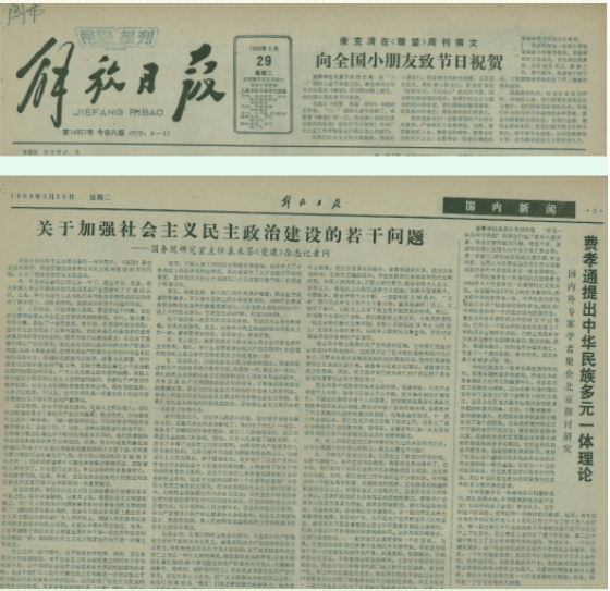 1991年5月29日,《解放日报》报道《费孝通提出中华民族多元化一体理论》(民盟成都市武侯区总支藏)