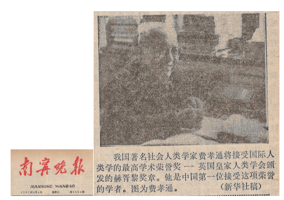 1981年11月4日,《南宁晚报》发表新华社新闻稿:我国著名社会人类学家费孝通将接受国际人类学的最高学术荣誉奖——英国皇家人类学会颁发的赫胥黎奖章。他是中国第一位接受这项荣誉的学者。