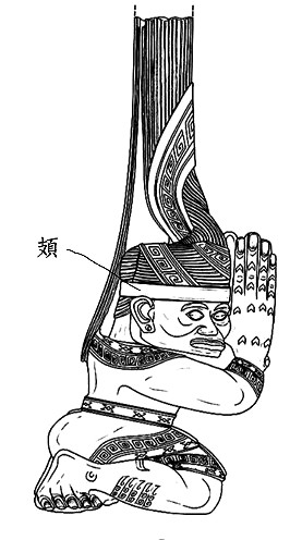 二是项中有称为“(图3)”的物件,贾疏认为即是结,作用是“固頍”。頍的用法,是从前额围向后脑,但在项中并不连接,呈断缺状,故又称“缺项”。其原因,殆是人脑的围圆相去很大,頍很难用同一的尺寸。为了将有缺口的頍拴住,贾疏云:“頍之两头皆为(图3),別以绳穿(图3)中,结之,然后頍得牢固。”