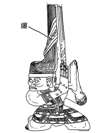三星堆扭头铜人展示的,正是中原地区贵族通行的绹发为髻的情景,堪称是以頍整齐发际,以纚与发缠绕的特写。铜人两手手掌相向分开,掌间当原有嵌入之物,惜已朽烂无存。鄙见,掌间原先当有“T”形之物,下端插入掌间空隙,上端略如小型平台,上放笄、冠等物,以示设冠仪式之全过程。
