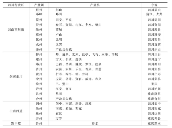 唐代剑南西川道、剑南东川道、山南西道、黔中道四道盐井分布表