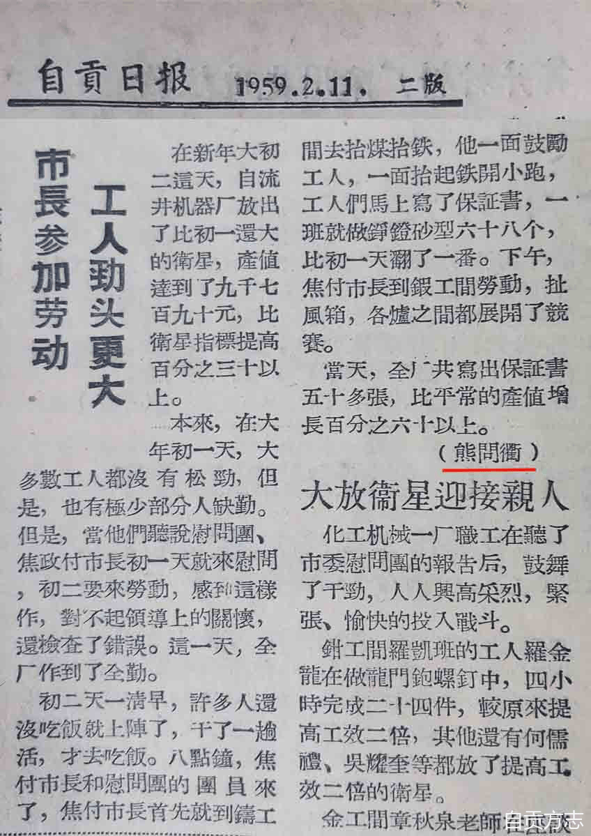 2020年初,疫情汹汹来袭,宅家依托既有资料开始整理焦政年谱。4月8日,疫情稍微缓解,走出去翻阅旧报,发现1959年2月11日《新自贡报》刊有一篇通讯员熊问衢的报道《市长参加劳动 工人劲头更大》,叙写焦政副市长大年初二到自流井机器厂参加劳动的事:上午在铸工间抬煤抬铁,下午在锻工间扯风箱,鼓舞了工人干劲,促进了当天产值跃升,达到9000多元,比平时增长60%以上。