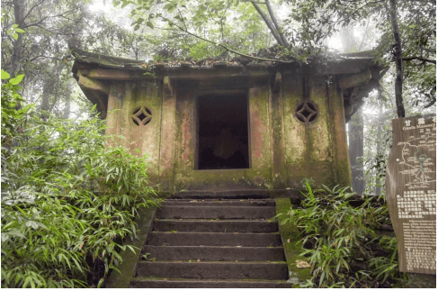 甘露石屋位于皇茶园左侧甘露峰,明代全石结构建筑。石柱、石殿、石斗拱、石屋面,漏光不漏雨,建筑风格甚为独到。相传此地原为茶祖吴理真种茶休憩之所,明嘉靖十九年(1540年)由僧人洪音修建石室作凭吊祭祀之用。