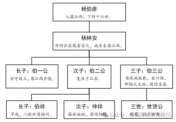 仔细梳理以上几段文字,我们基本上可以清楚地描绘出麻城西阳镇和新都杨慎家族世系图及迁徙路线如下: