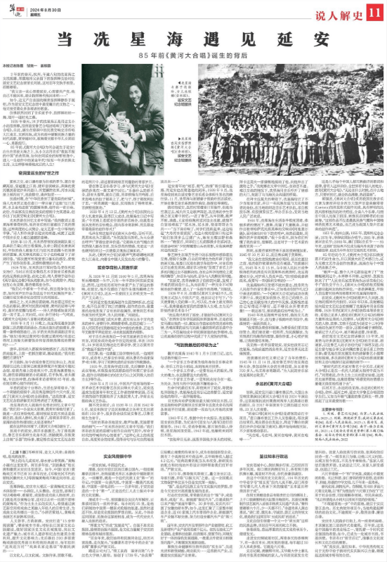 “冼星海只有到了延安,才能创作出《黄河大合唱》。”在西安音乐学院副院长郭强看来,正是在延安耳濡目染的一切,激发出作曲家创作的灵感和热情,苦难深重的哀叹与充满力量的怒吼在乐曲中合二为一,不仅凝结成中华民族顽强的抗争精神,也让冼星海在创作过程中完成了个人党性的淬炼。
