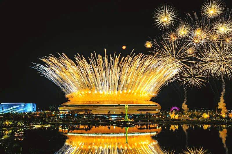 2023年7月28日晚,第31届世界大学生夏季运动会在成都开幕。图为在成都市龙泉驿区东安湖体育公园举行的大运会开幕式燃放焰火仪式(新华社记者 胡超 摄,图源:四川日报)