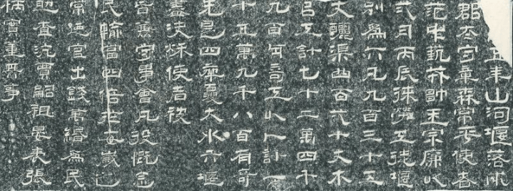 小篆在向隶书过渡时出现了古隶,把瘦长的小篆变成了扁状的隶书。这种风格的字体在四川雅安出土的《何君阁道碑》等也曾看到。但就石刻的体量而言,《鄐君开通褒斜道》无出其右。这方石刻文字159个,扁宽的字形,字势向横向拓展,显得宽博开阔。即使是方形的字,四角撑满,外轮廓的茂密与结构内部的空灵,都给人以丰满、粗犷、开放的感觉。清代文学家刘熙载曾评价这方石刻文字为“隶之古也”。
