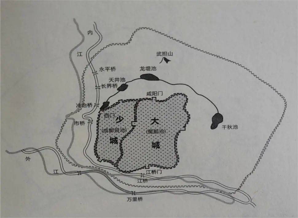 汉武帝元鼎二年(前115年)重筑成都城,将秦少城、大城合围在内,呈“两江珥其市,九桥带其流”景象;