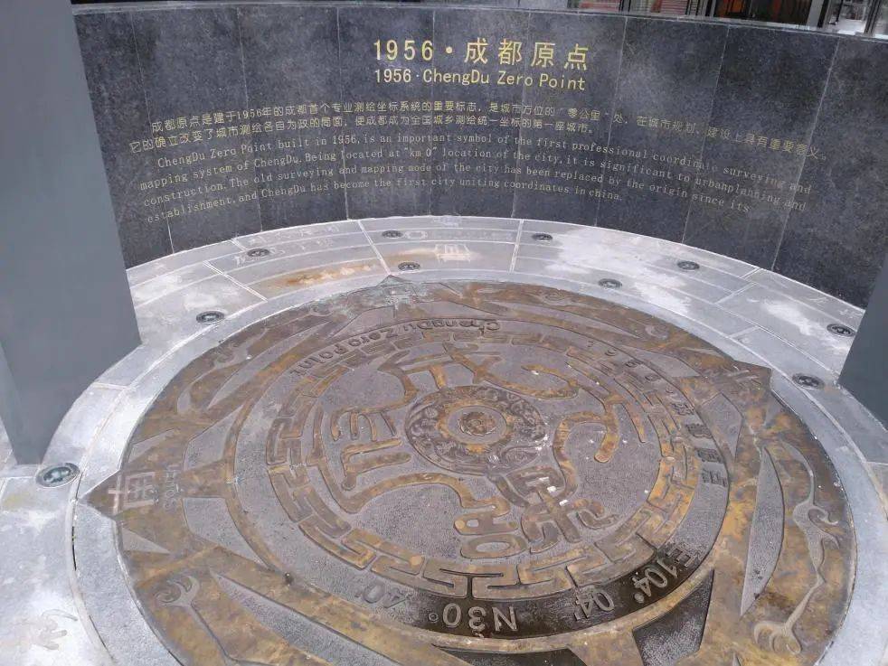 其标志物坐落在青羊区文武路与锣锅巷交叉路口西侧,标识此处为成都地理中心和城市方位“零公里”,设于1956年。