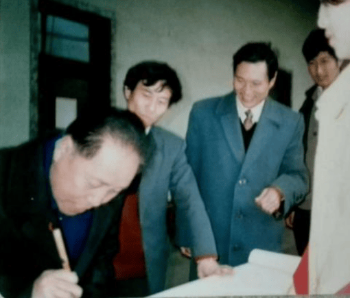 听说是给老书记的画,我急步上前,刚落好的上款的彩墨画,老师马上要落下款了!由于字体太小,只见他重新戴上老花镜,伏案握笔,专心致志,细小的笔尖还没有接触宣纸就在临空动笔,连续写了几遍才完成“汝岱同志正”。