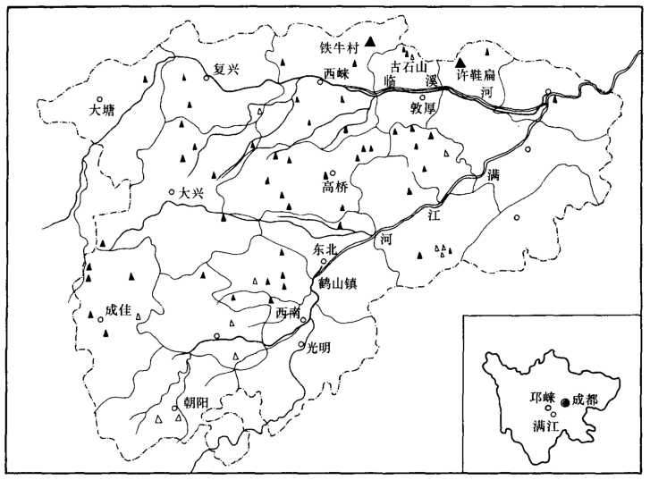 蒲江县境内冶铁遗址分布图(▲为古代冶铁遗址,△为近代冶铁遗址)(图源:蒲江县史志办)