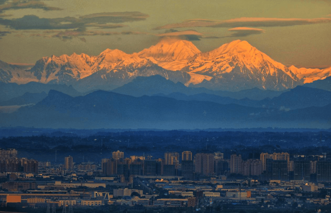 日落时的贡嘎雪山与蒲江(图源:绿色蒲江 ,罗国建 摄)