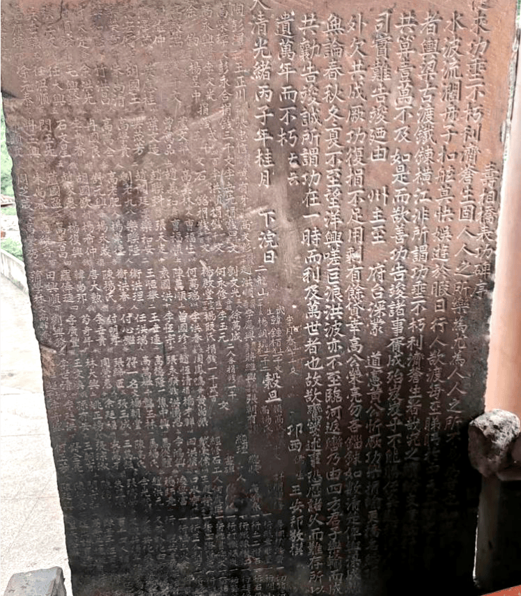 表功碑两面,刻有序言。除序言外的地方,密密麻麻刻满捐款者的姓名、捐款数额。