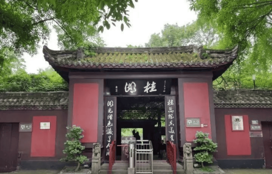 新都区的桂湖公园大门口匾额“桂湖”是当代文豪郭沫若1963年中秋所题,联语“桂蕊飘香美哉乐土,湖光增色换了人间”用了对联传统的“鹤顶格”形式将“桂湖”二字巧妙嵌在句首。