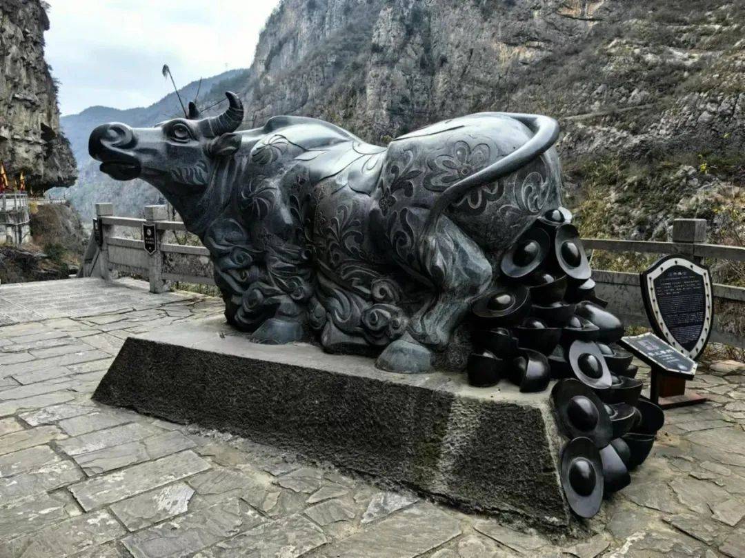明月峡古栈道“石牛粪金”雕塑(图源:看度时政 )