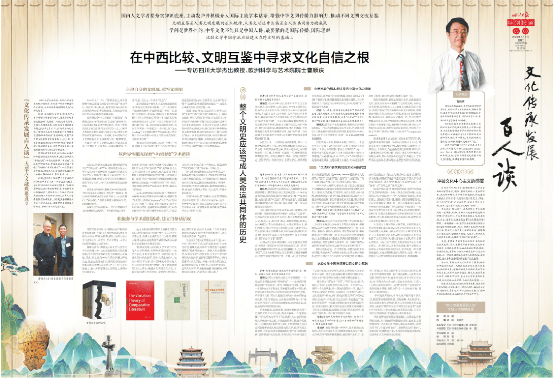 完成采访,写出稿件,我忽然明白了大学期间的一些事情。比如,为什么川大会开设校级必修课《中华文化》,并由曹顺庆教授主编同名教材;比如,为什么文新学院会有《文化原典导读》课程,一学期精读一部《老子》《世说新语》《维摩诘经》这样的传统经典;比如,为什么我们的中国古代文学、现当代文学乃至文学理论教材,满篇都是不太容易消化的原典原文;又比如,为什么我们的很多老师,都强调“跨学科”和“兼通”……我想,原因在于前辈学者的学术实践和研究成果表明, 深入理解中华优秀传统文化和不同国家、不同民族的文化,在此基础上贯通、融通、会通和比较,方有助于我们冲破文化中心主义的藩篱,以一种世界性的眼光看待人类的文化、文明成果,在人类命运共同体的框架下交流互鉴。