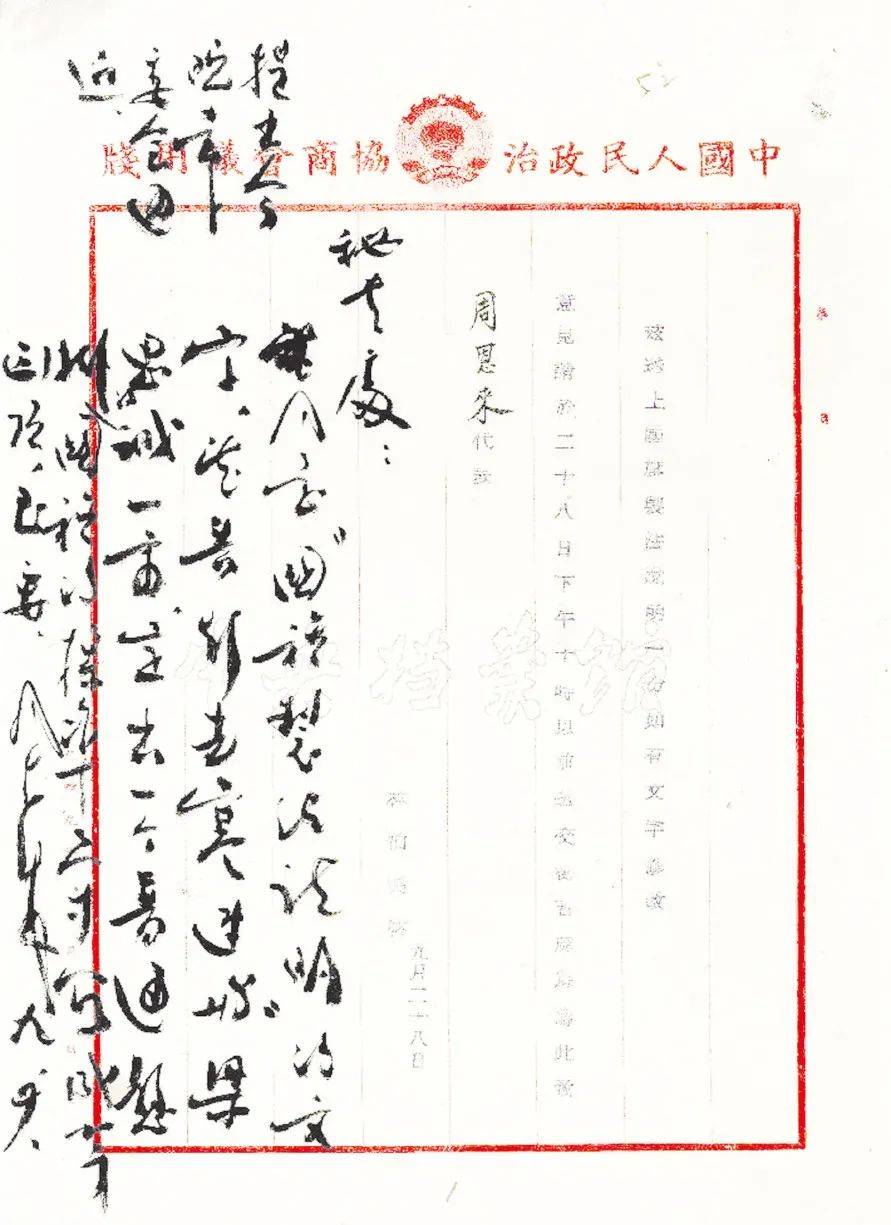 1949年9月28日,林伯渠关于征求对《国旗制法说明》的意见函及周恩来批示(中央档案馆藏)